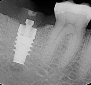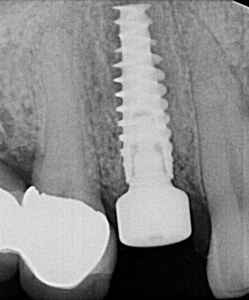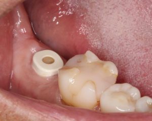 Preoperative 3D imaging is helpful in visualizing the patient’s anatomy and screening the ideal candidate. Since there is limited bone available, a dental implant with aggressive threading is important to obtain good primary stability. Typically, the socket is larger than the diameter of the dental implant and a bone graft is required to fill the space. A large stock, or customized healing abutment, can then be used to contain the bone graft and allow for ideal soft tissue healing.